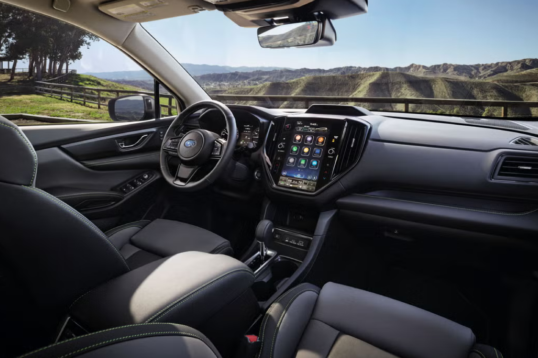 The Subaru Ascent, the brand's largest SUV, offers up to 153.2 cubic feet of passenger space—more than the Toyota Highlander. It's perfect for family adventures with durable materials, convenient tech, and comfortable seating options for 7 or 8 passengers. The 7-passenger model features captain's chairs in the second row. All models provide spacious seats, wide rear doors, ample cargo space, and underfloor storage. The second row has 60/40-split flat-folding seatbacks for larger items, while the versatile seating configurations allow for up to 75.6 cubic feet of cargo. With 19 cup holders and an available 54-inch panoramic moonroof, the Ascent enhances the spacious and bright interior.
